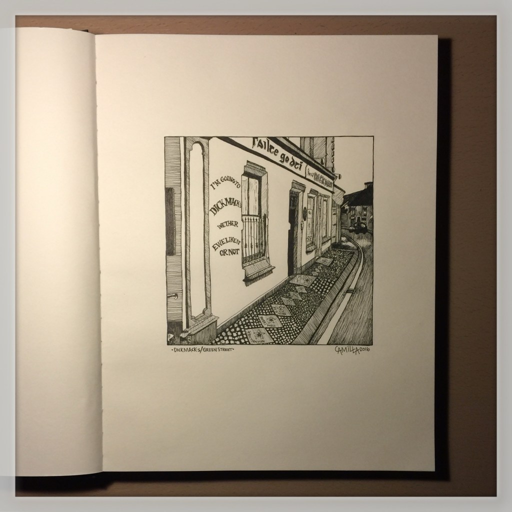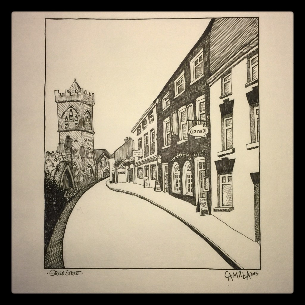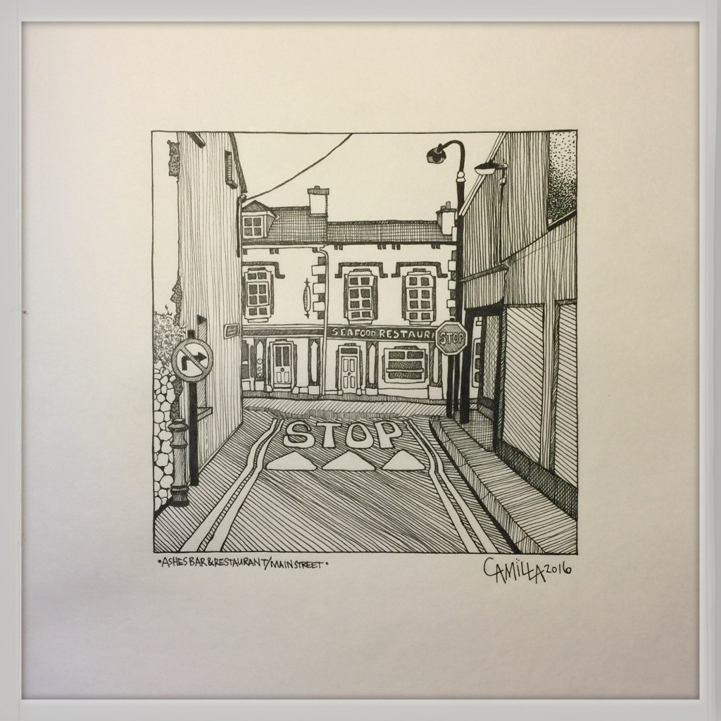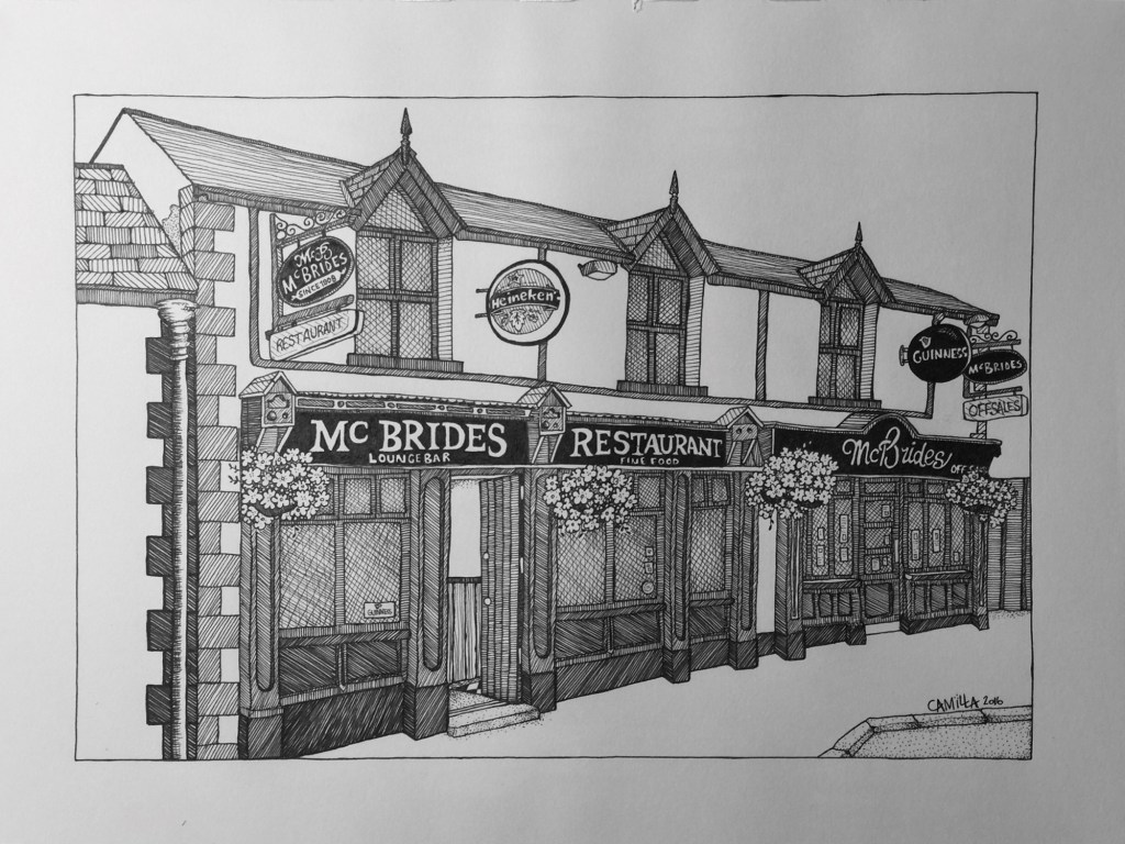 The following images are drawing of street views in Ireland and Sweden. I start working with pencils and I finish them off with line markers.